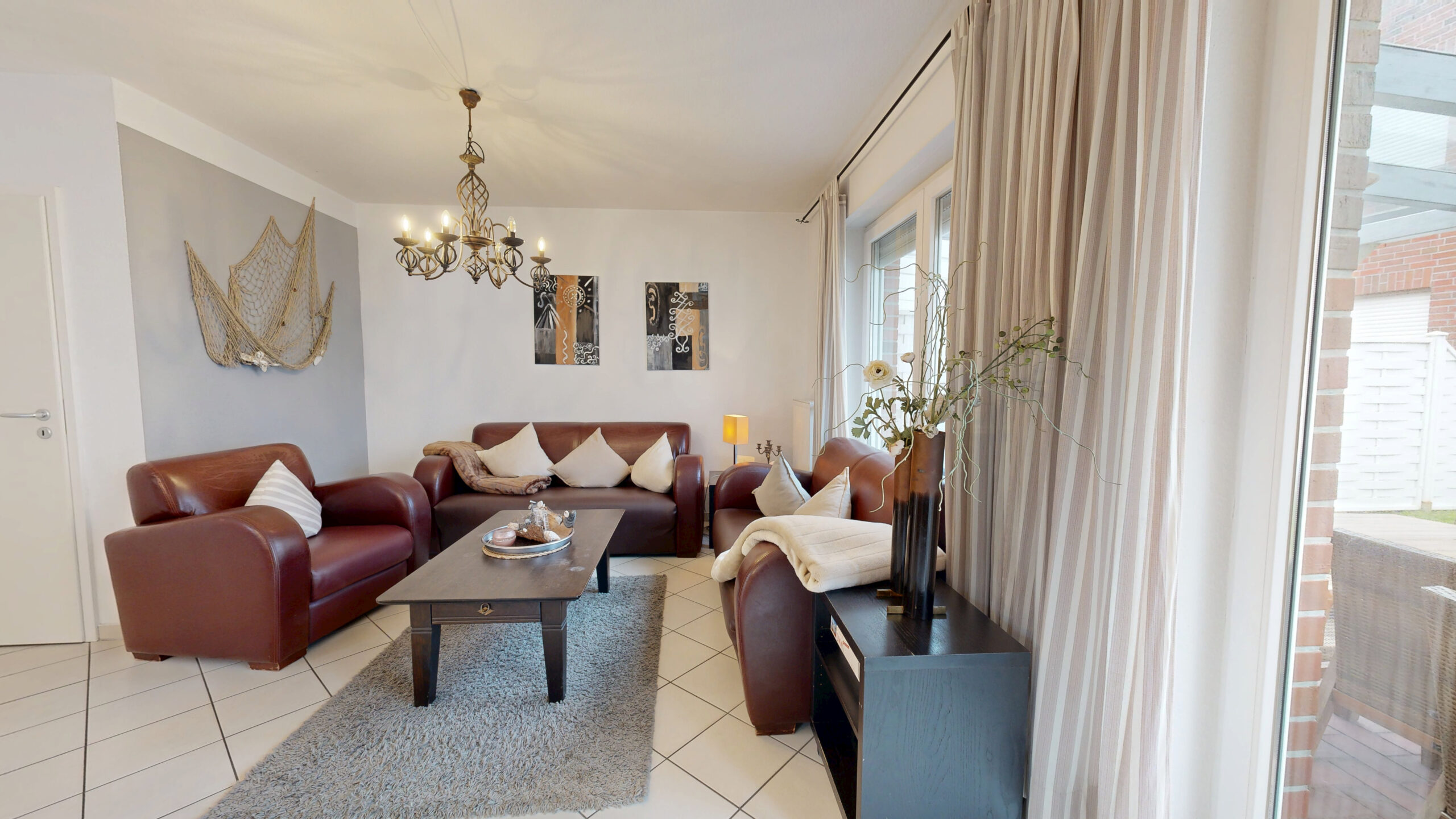 Die Wohnung bietet vier gemütliche Schlafzimmer, von denen drei über einen eigenen Fernseher verfügen. Im Obergeschoss befindet sich ein helles, geräumiges Badezimmer, während das Erdgeschoss mit einem zusätzlichen Bad mit Dusche ausgestattet ist.